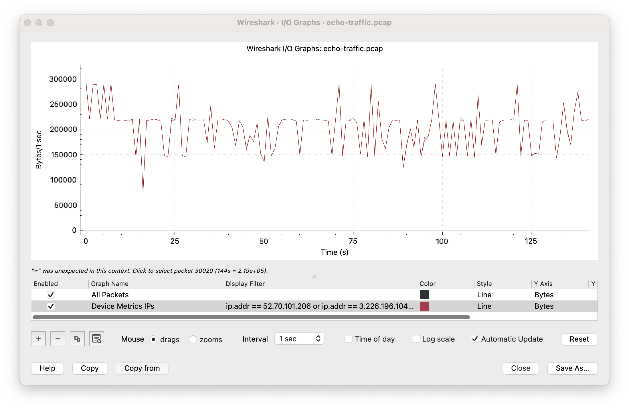 That's a lot of big TLS packets heading out to an EC2 machine, with no reverse DNS entries. Let's dump all the raw packets from the Echo to a file, and then see what Wireshark can make of it: